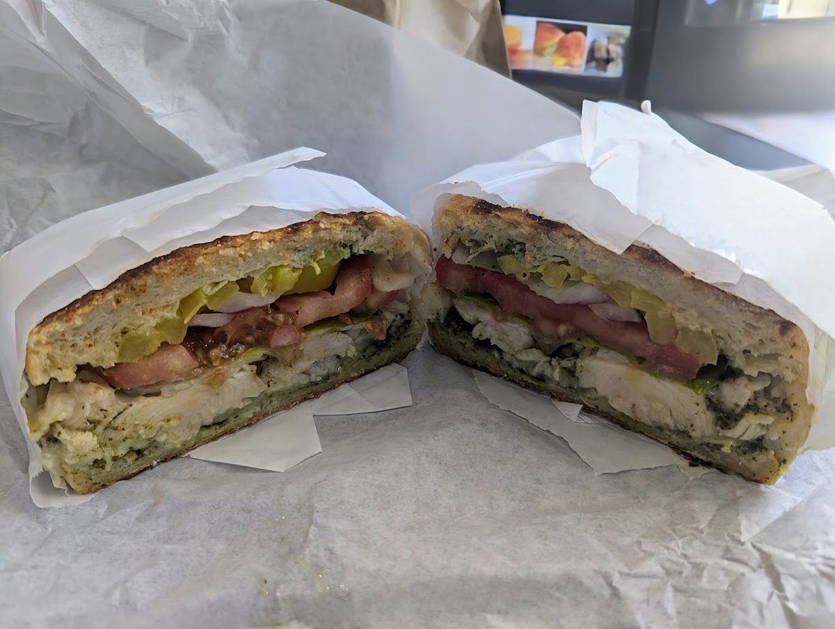The chicken pesto panini here is hefty and good. Good crisp on the bread from the press, and everything goes together quite well. The cafe is also a bit of a general store with packaged snacks and desserts, which is a plus.